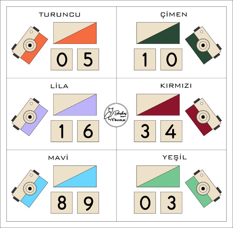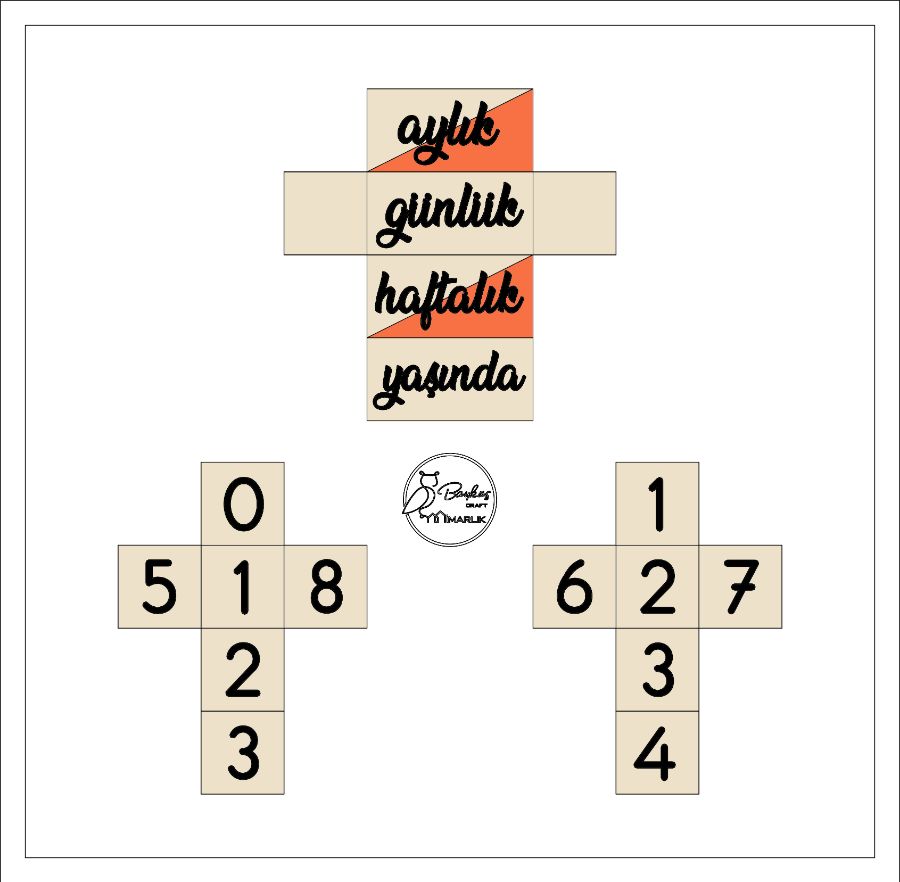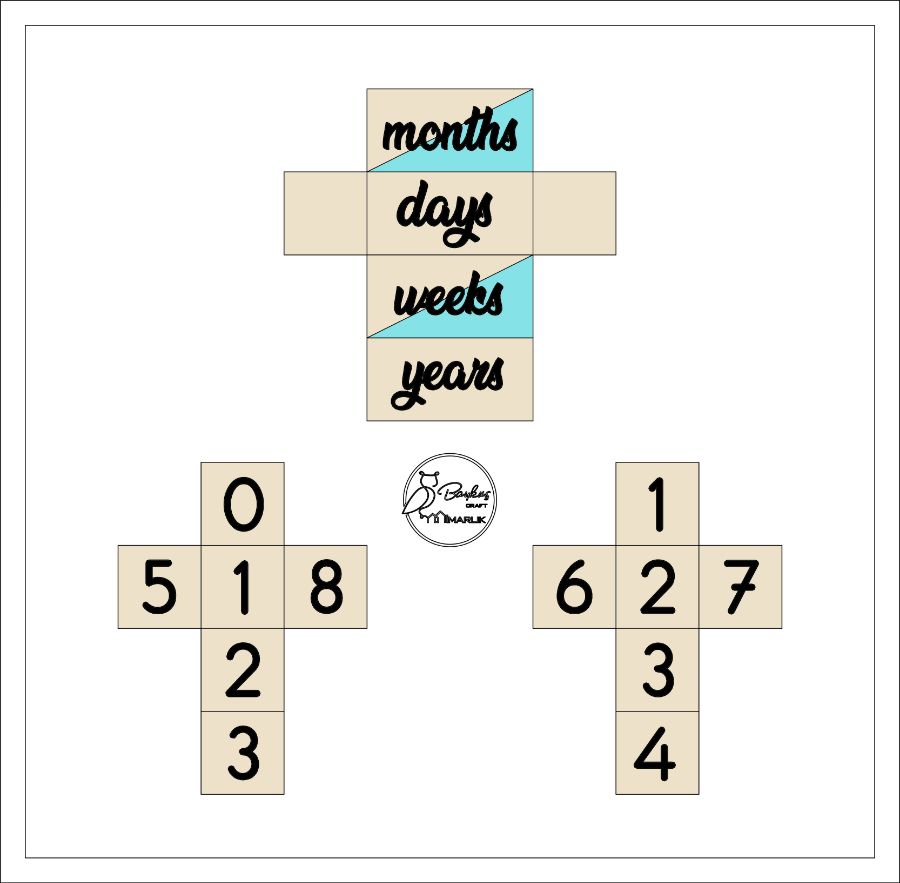 * Ürün Boyutları ve Paket İçeriği: 1 Adet İsim Prizması (6.5x13 cm) - 2 Adet rakam küpü (6.5x6.5 cm) – 1 Adet days, weeks, months, years prizması (6.5x13 cm) - 1 Adet ahşap fotoğraf makinesi (7x10 cm)